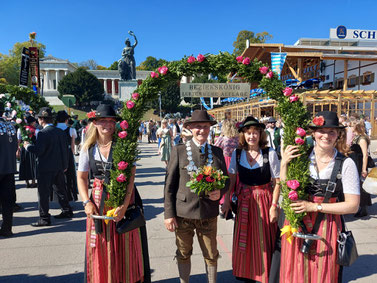 Unser Bezirksschützenkönig Luftgewehr Auflage, Harry Mayer in Begleitung seiner Ingrid und den Bogenträgerinnen Veronika und Maria vor der Bavaria am Oktoberfest.