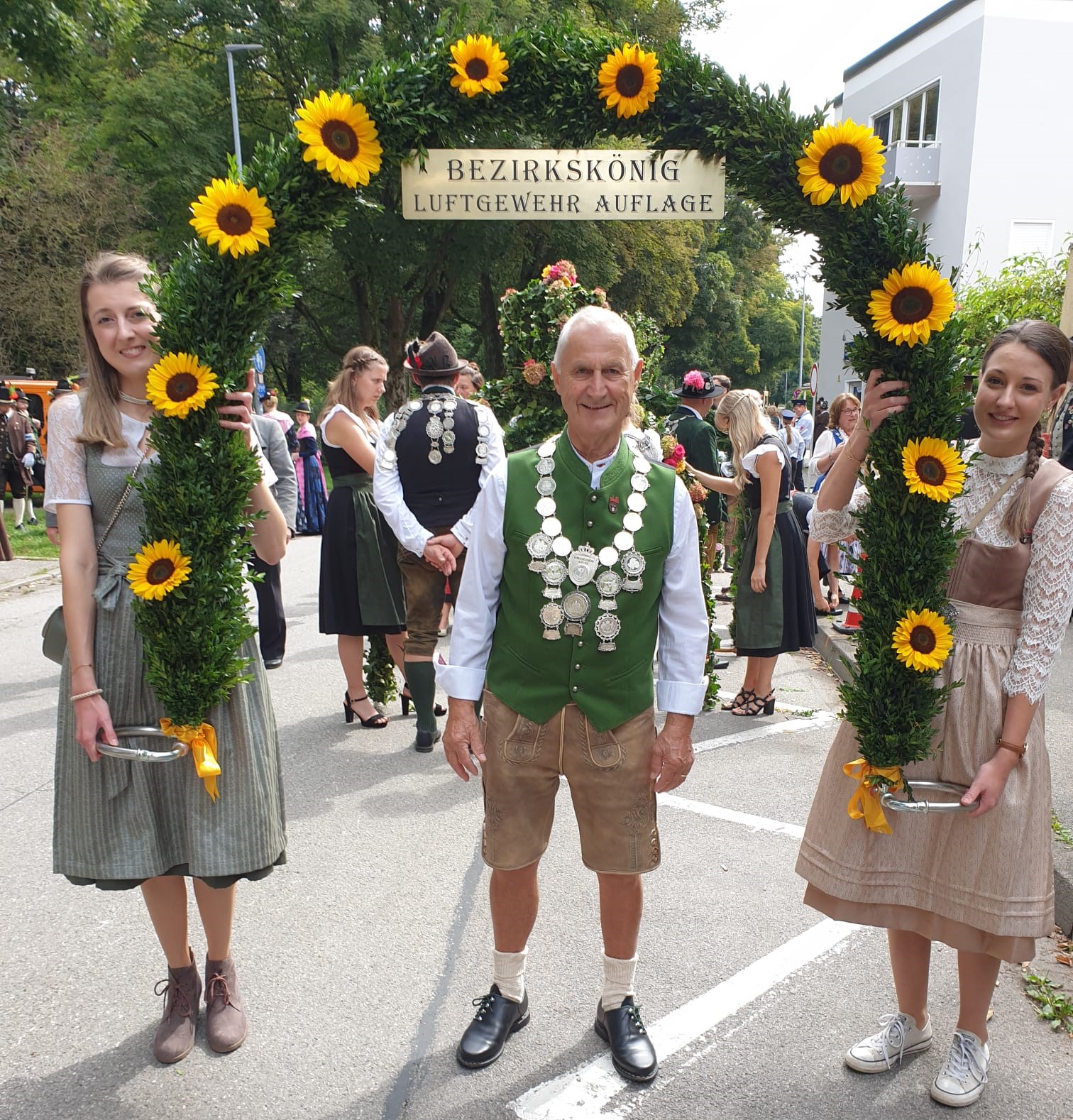 Unser Bezirksschützenkönig Luftgewehr Auflage, Harry Mayer in Begleitung seiner Ingrid und den Bogenträgerinnen Veronika und Maria vor der Bavaria am Oktoberfest.
